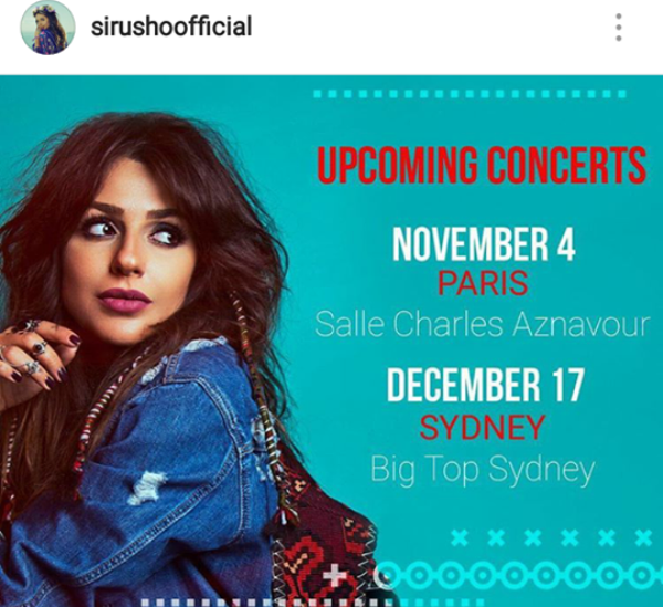 Սիրուշոն համերգ պիտի Ունենայ Փարիզի եւ Սիտնէյի մէջ: Այս մասին երգչուհին կը տեղեկացնէ Instagram-ի իր էջով։