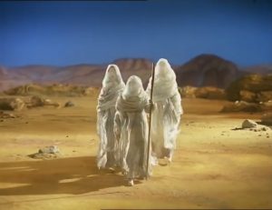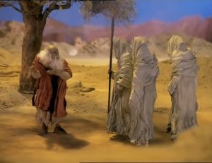 Օր մը, երբ Աբրահամը ցերեկուան տաքին նստած էր վրանի մուտքին մօտ, յանկարծ անոր դիմաց երեք մարդ յայտնուեցան։